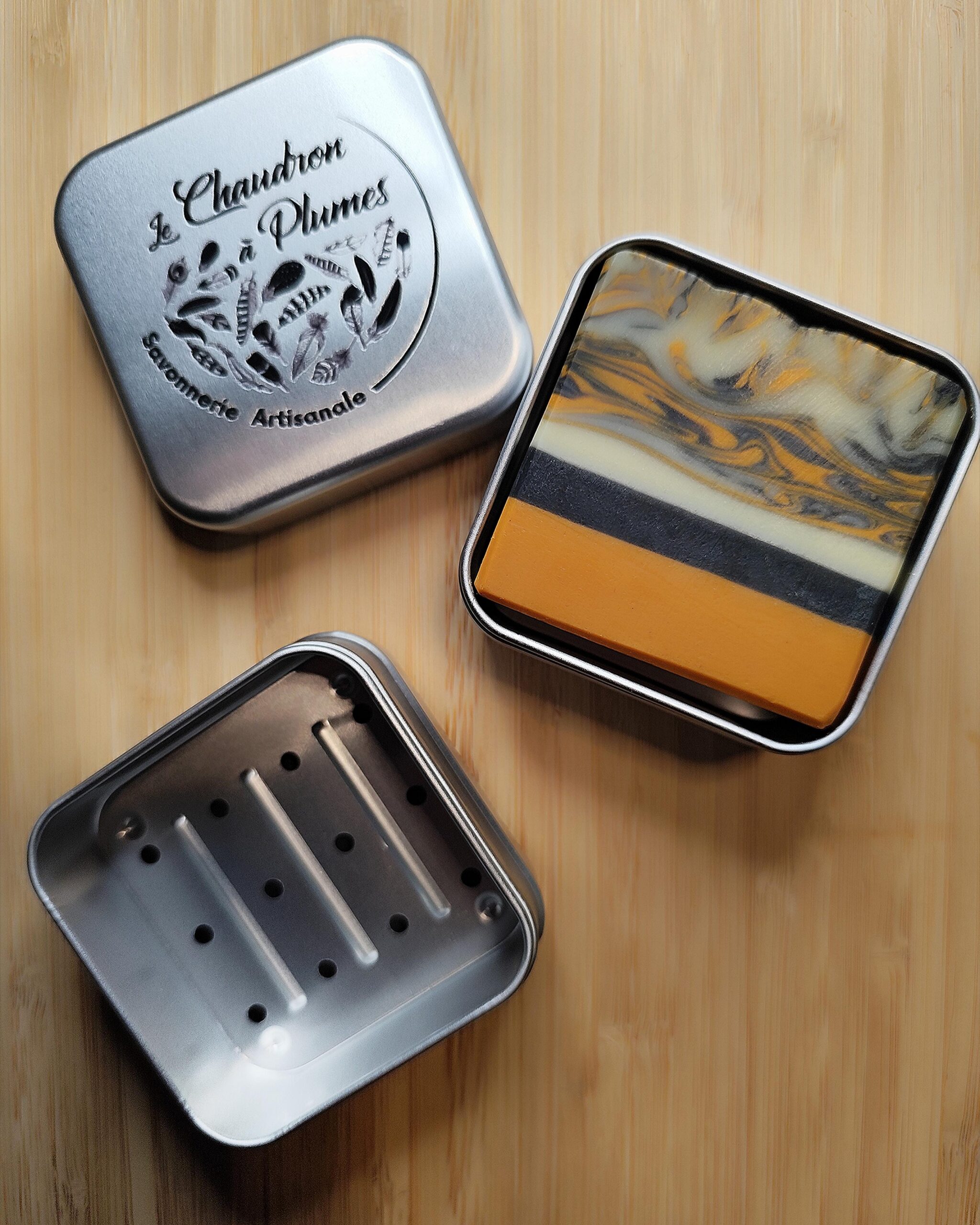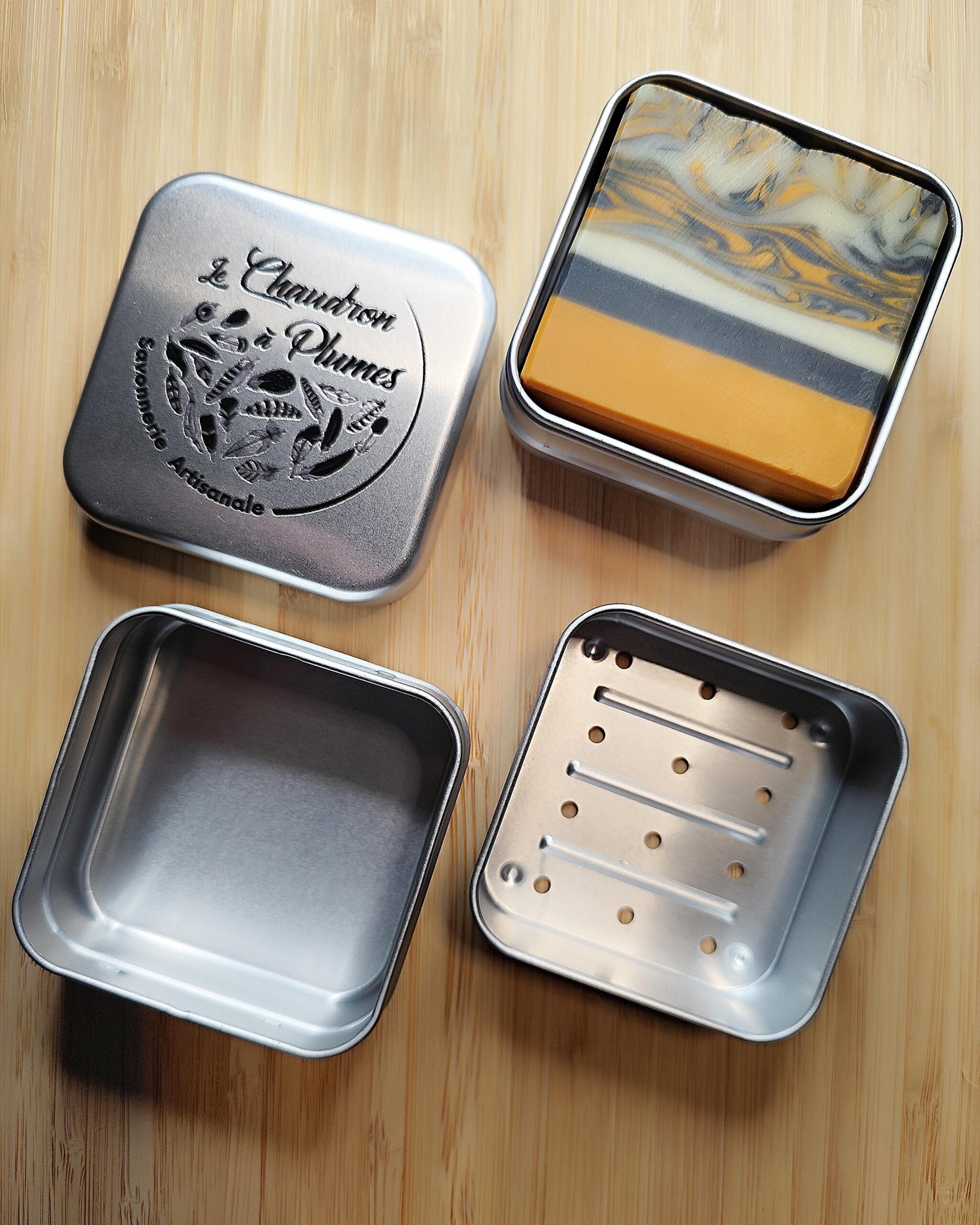Une jolie boîte à savon en aluminium avec égouttoir amovible.