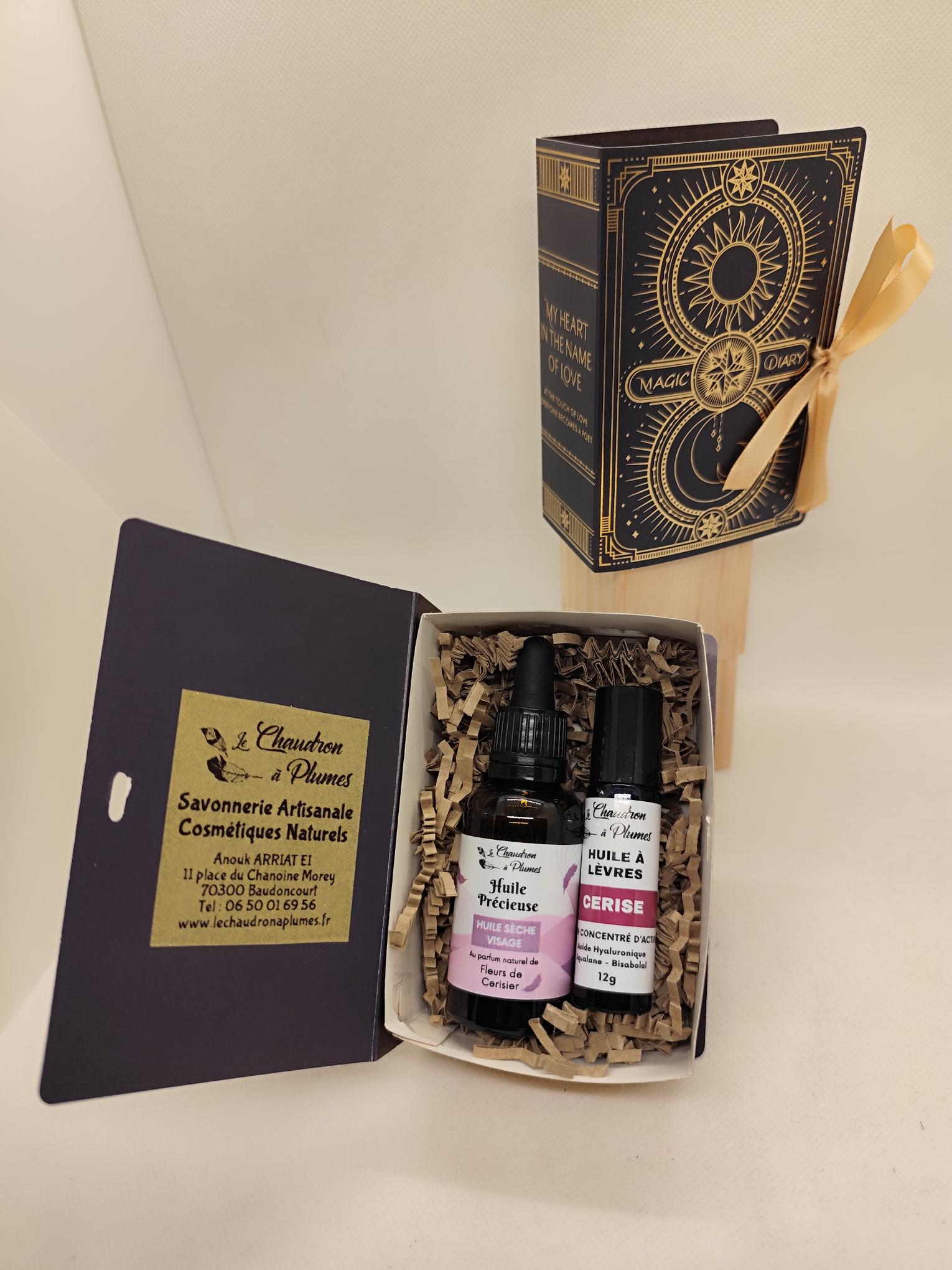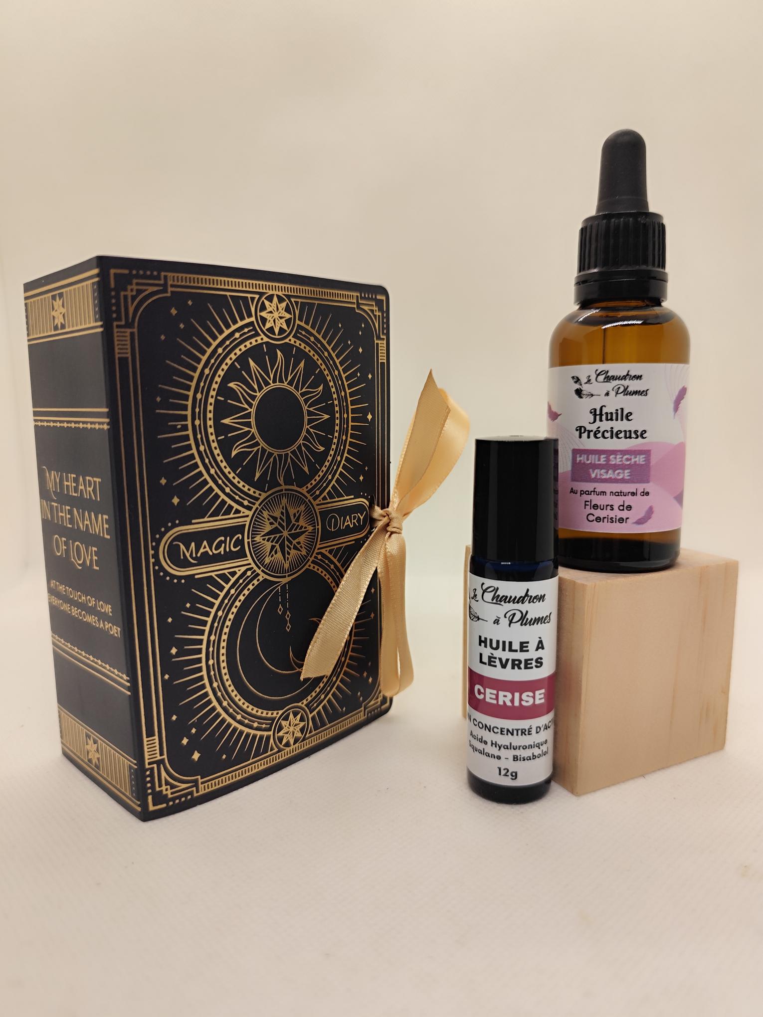 Petit coffret cadeau en forme de grimoire contenant une huile précieuse Fleur de Cerisier ainsi qu’une huile à lèvres Cerise.